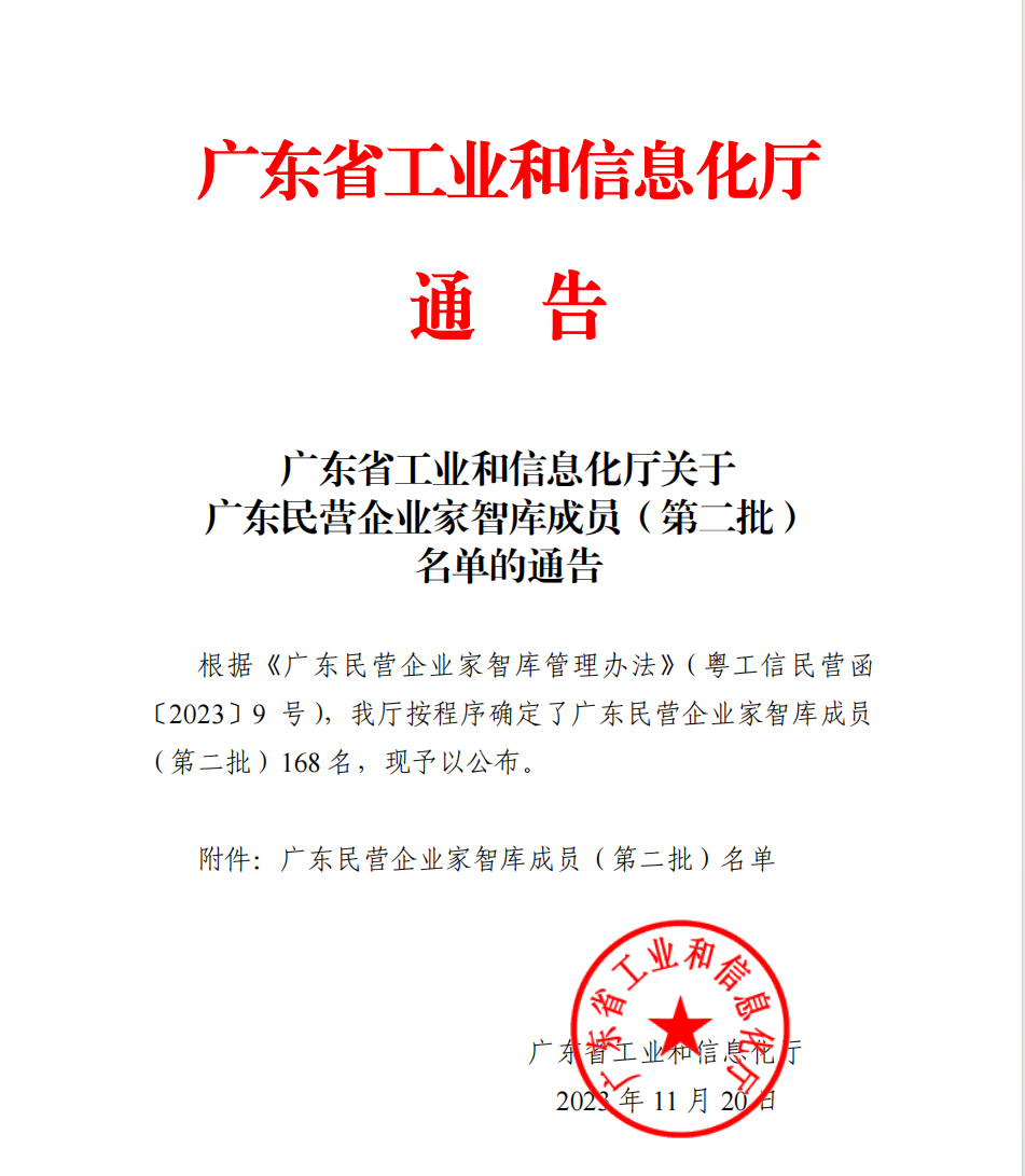 彭國遠董事長當選廣東省工信廳【廣東民營企業(yè)家智庫成員】
