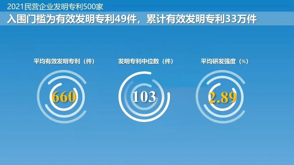 報(bào)告透露,“2021民營(yíng)企業(yè)研發(fā)投入500家榜單”入圍門(mén)檻為上年度研發(fā)投入2.37億元。500家企業(yè)研發(fā)費(fèi)用總額7429億元,其中,研發(fā)投入最高的企業(yè)研發(fā)費(fèi)用1419億元?!?021民營(yíng)企業(yè)發(fā)明專利500家榜單”入圍門(mén)檻為擁有有效發(fā)明專利49件。500家企業(yè)累計(jì)擁有有效發(fā)明專利33萬(wàn)件,其中,有效發(fā)明專利最多的企業(yè)共擁有9萬(wàn)件發(fā)明專利。
