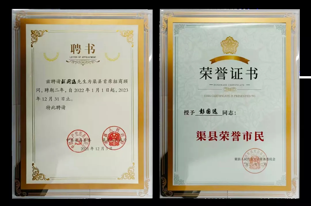 彭國遠董事長被聘為首席招商顧問,并頒發(fā)渠縣榮譽市民證書