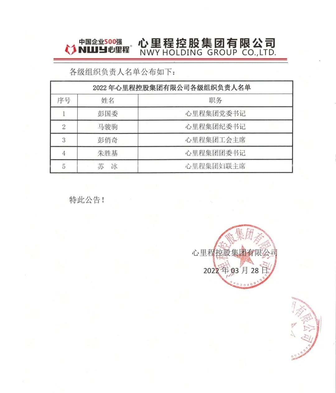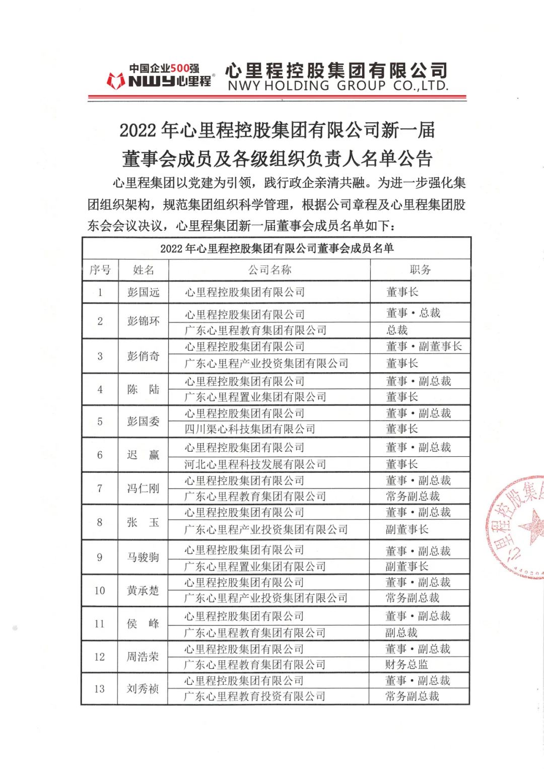 為進一步強化集團組織架構(gòu),規(guī)范集團組織科學管理,日前,心里程集團召開股東會議,并根據(jù)公司章程及會議討論研究,決定了新一屆董事會成員。3月28日,心里程集團正式對外公布新一屆董事會成員和各級組織負責人。新一屆董事會成員由彭國遠、彭錦環(huán)、彭俏奇、陳陸、彭國委、遲贏、馮仁剛、張玉、馬駿駒、黃承楚、侯峰、周浩榮、劉秀禎十三位成員組成,彭國遠連任集團董事長。(人員名單如下)