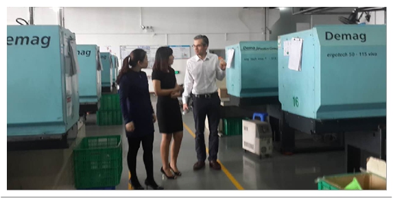 David參觀車間期間,對我司制造設(shè)備的高精度且擁有高水準的模具制造技術(shù)表示贊賞,尤其對我司引進的德國DEMAG注塑機和日本發(fā)那科注塑機高度認可,這無疑對我們的技術(shù)信任度更加深一層。此外,對我們的生產(chǎn)運作流程也是高度的稱贊及認可,并在廠區(qū)拍照留作依據(jù),表示其現(xiàn)有項目及今后的新項目我司將會是他們的主要選擇對象。