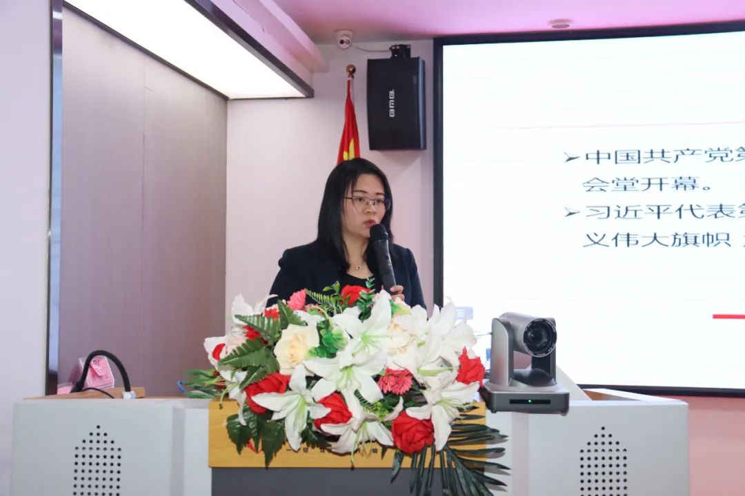 會上,肖丹副教授生動解讀了黨的二十大報告的主要內容及精神要點,強調要深刻認識馬克思主義在意識形態(tài)領域的指導地位,并從“大會概況及重要意義”“如何學習領悟二十大精神”“貫徹落實二十大精神”等3個方面談起,號召廣大黨員要深入學習全會精神,緊密團結在以習近平同志為核心的黨中央周圍,維護黨的集中和統(tǒng)一領導,建設具有強大凝聚力和引領力的社會主義意識形態(tài)。她指出,要充分認識黨的二十大精神的重大意義,堅持全面系統(tǒng)學、深入思考學、聯系實際學,深刻理解領會報告的精神實質和豐富內涵,以實際行動忠誠擁護“兩個確立”,增強“四個意識”,堅定“四個自信”,做到“兩個維護”,切實把思想和行動統(tǒng)一到黨的二十大精神上來。
