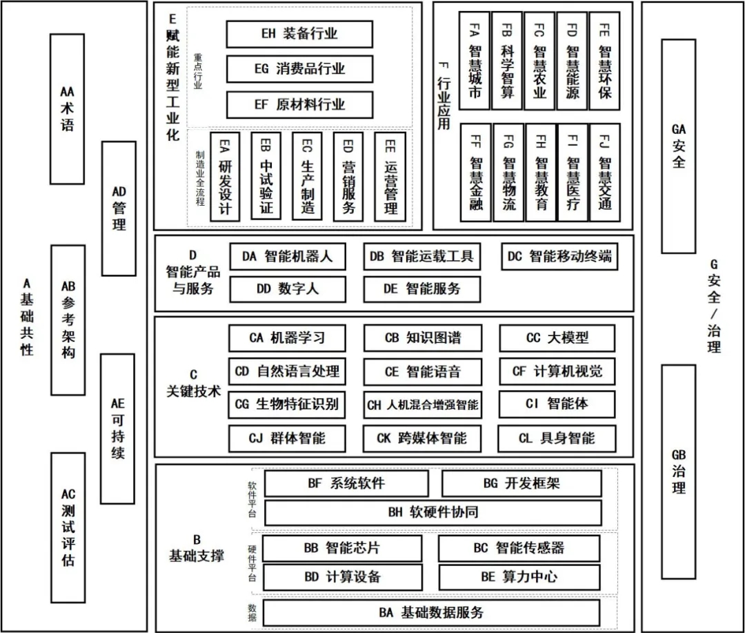 基礎(chǔ)共性標準主要包括人工智能術(shù)語、參考架構(gòu)、測試評估、管理、可持續(xù)等標準。