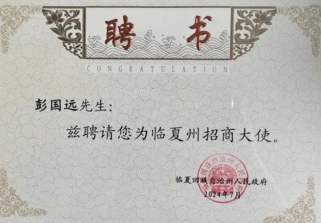 7月5日,第三十屆蘭洽會(huì)臨夏州招商引資項(xiàng)目專場(chǎng)簽約儀式在蘭州市舉行,共敘友情、共謀發(fā)展、共話未來(lái)。省人大常委會(huì)黨組副書記、副主任馬廷禮,省政協(xié)副主席馬文云出席,州委書記李海默致辭,州委副書記、州長(zhǎng)何東主持。彭國(guó)遠(yuǎn)董事長(zhǎng)應(yīng)邀出席活動(dòng),并獲聘“臨夏州招商引資大使”。