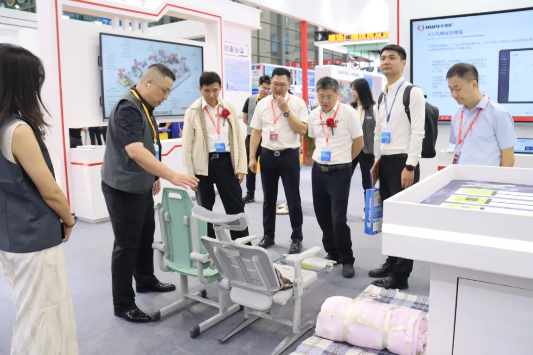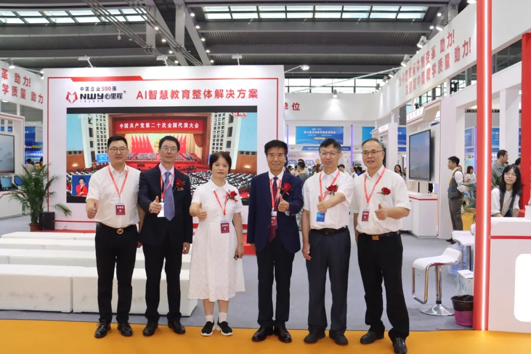 四川省教育裝備行業(yè)協(xié)會(huì)會(huì)長(zhǎng)張林祥(左三)蒞臨心里程展位參觀指導(dǎo)