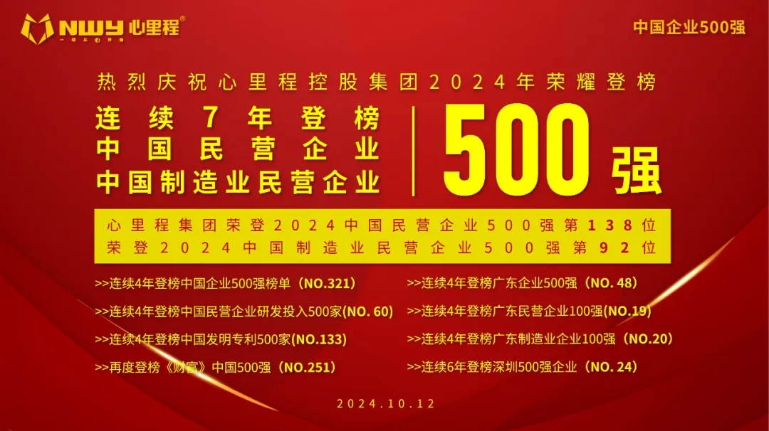 近期來,心里程集團可謂好消息不斷,榮譽接踵而至,此前已在多個重量級榜單中脫穎而出,比如榮登2024中國企業(yè)500強榜單第321位;2024民營企業(yè)研發(fā)投入500家第60位;2024民營企業(yè)發(fā)明專利500家第133位;2024年《財富》中國500強榜單第251位;2024廣東企業(yè)500強第48位;2024廣東民營企業(yè)100強第19位;2024廣東制造業(yè)企業(yè)100強第20位;2024深圳500強企業(yè)第 24 位。這些榮譽不僅是對心里程集團過去努力的認可,更是對我們未來發(fā)展?jié)摿Φ纳疃韧诰蚝推诖?/span>