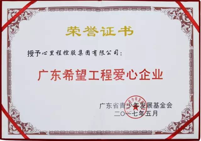 2017年5月【廣東省青少年發(fā)展基金會】授予【廣東心里程控股集團】廣東希望工程愛心企業(yè)的稱號。