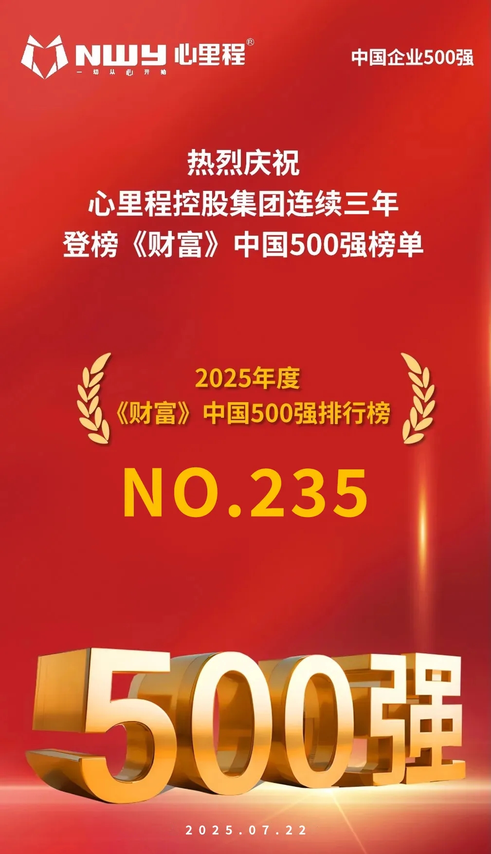 7月22日,財富中文網(wǎng)正式發(fā)布2025年《財富》中國500強(qiáng)排行榜。該榜單采用與《財富》世界500強(qiáng)一脈相承的制榜方法,同時包括了上市和非上市企業(yè)。依據(jù)這個榜單及其數(shù)據(jù),人們可以了解中國最大企業(yè)的最新發(fā)展趨勢。FORTUNE.com也已全球同步發(fā)布了該榜單的英文版。在此次榜單中,心里程控股集團(tuán)有限公司(以下簡稱“心里程集團(tuán)”)憑借在教育信息化及產(chǎn)業(yè)投資等領(lǐng)域的突出表現(xiàn),榮登榜單第235位,較2024年提升16位。