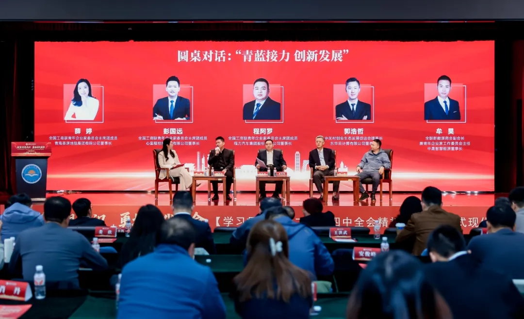 在圓桌對話環(huán)節(jié),彭國遠(yuǎn)董事長與全國工商聯(lián)青年企業(yè)家委員會主席團成員、青海圣源地毯集團有限公司董事長薛婷,全國工商聯(lián)青年企業(yè)家委員會主席團成員、程汽車集團股份有限公司董事長程阿羅,中關(guān)村創(chuàng)業(yè)生態(tài)發(fā)展促進(jìn)會理事長、東華云計算有限公司董事長郭浩哲,全聯(lián)新能源商會副會長兼青年企業(yè)家工作委員會主任、中晟智慧能源董事長牟昊等嘉賓圍繞“青藍(lán)接力 創(chuàng)新發(fā)展”這一主題展開了深入的交流討論。