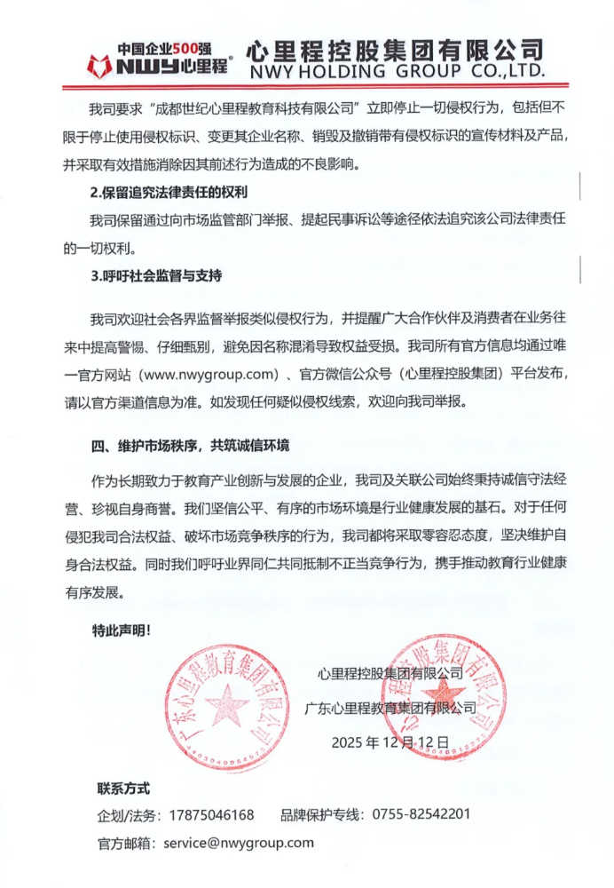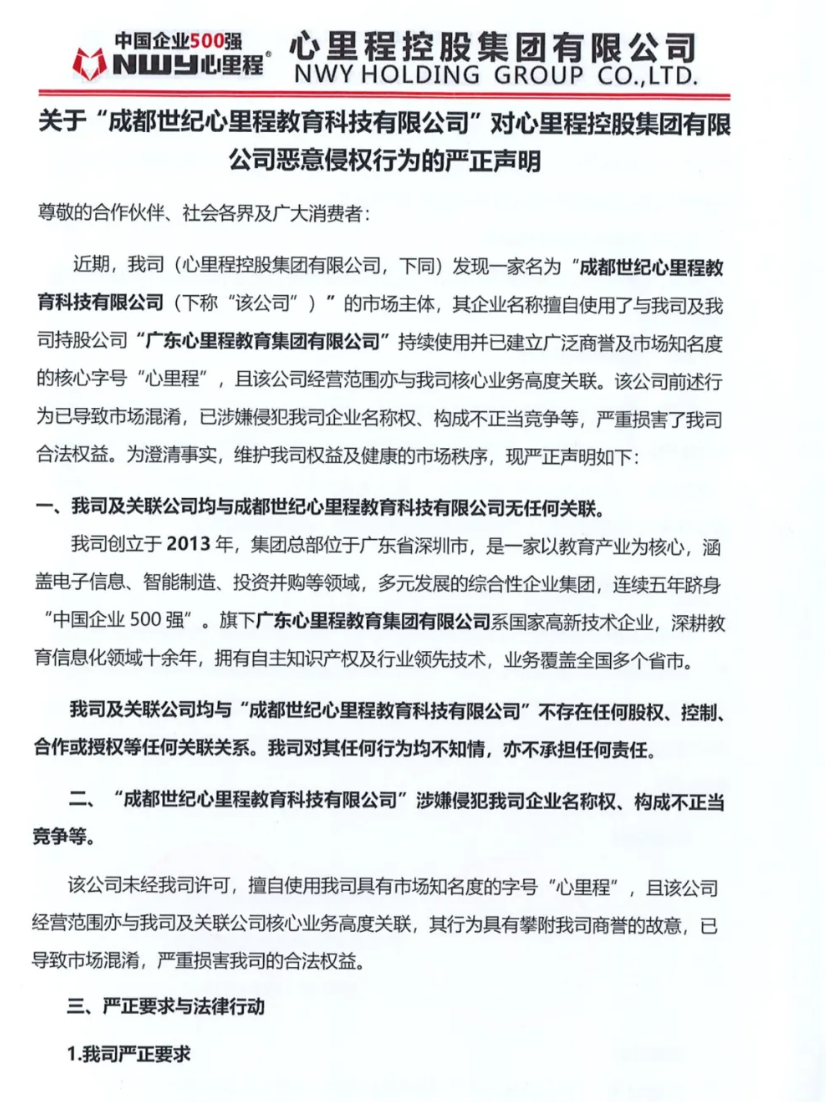 關(guān)于“成都世紀(jì)心里程教育科技有限公司”對心里程控股集團(tuán)有限公司惡意侵權(quán)行為的嚴(yán)正聲明