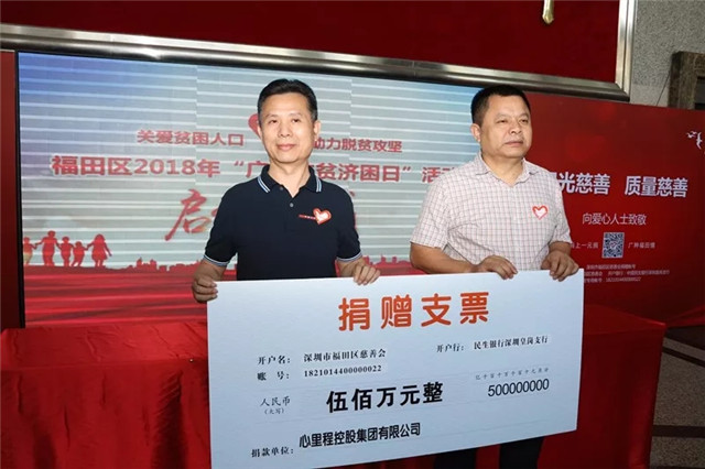 2018年,心里程集團(tuán)向深圳對口扶貧的汕尾市捐款2018萬元后,又向深圳市對口扶貧的河源市捐款500萬元。截至目前,心里程集團(tuán)已累計向社會捐贈超過1.4億元人民幣,曾獲“2015中國捐贈百杰榜”前20名、“2016胡潤中國慈善富豪排行榜”前20名等多項榮譽。