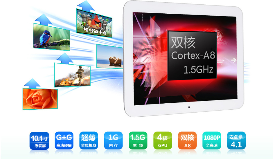 產(chǎn)品正面外觀尺寸267X178X11.2MM 內(nèi)置WIFI,支持802.11/B/G 支持多國(guó)語(yǔ)言 1G內(nèi)存 16G大容量硬盤(pán) 大屏平板電腦的主要屏幕規(guī)格均以9.7寸4:3的方屏為主。