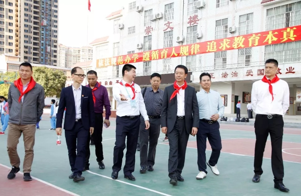 東源縣崇文學校學生為企業(yè)代表佩戴紅領巾