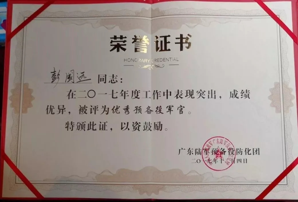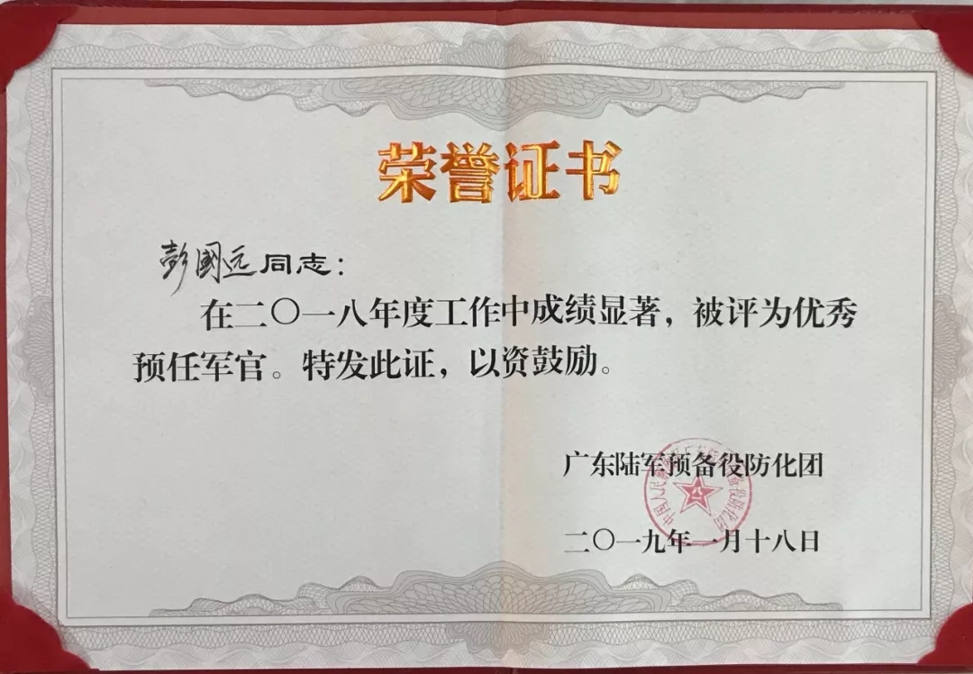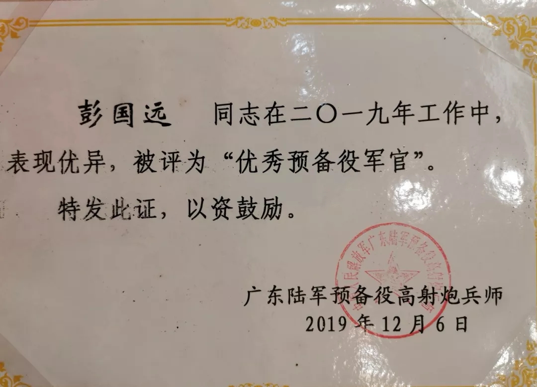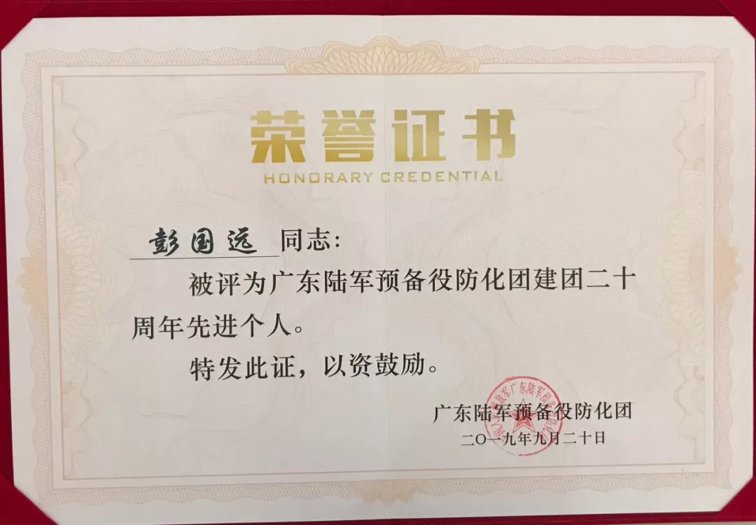 2019彭國遠榮獲廣東陸軍預(yù)備役防化團建團二十周年先進個人