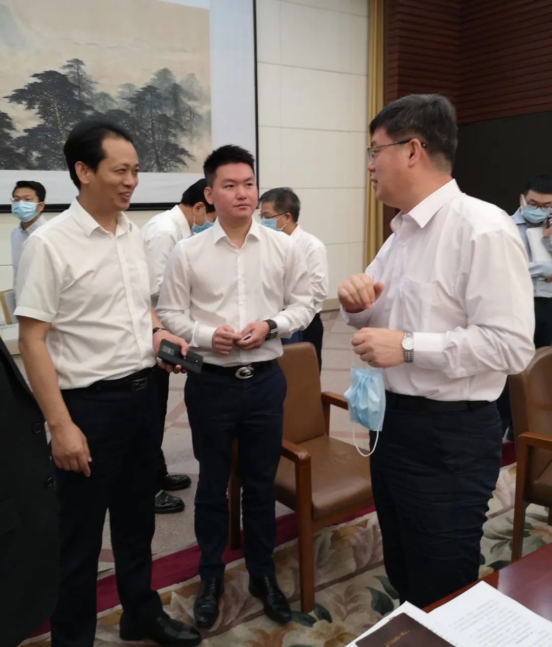 彭國(guó)遠(yuǎn)董事長(zhǎng)(中)與覃偉中副省長(zhǎng)(右)等領(lǐng)導(dǎo)交流